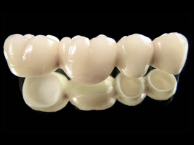 Quand il n’y a plus de racine on peut combler l’espace de la dent manquante par un bridge. Comme le terme anglophone l’indique, cette prothèse est pont fixé sur des piliers (les dents voisines) Il peut remplacer une ou plusieurs dents manquantes